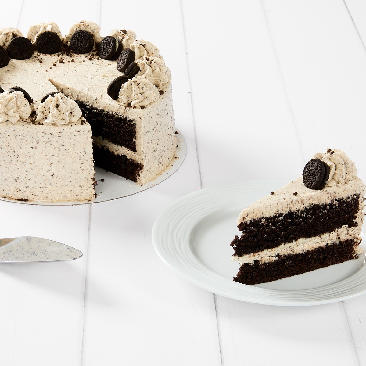 Chocolate sponge filled and coated in a cookies and cream icing, topped with mini Oreos and dark chocolate biscuit crumb.