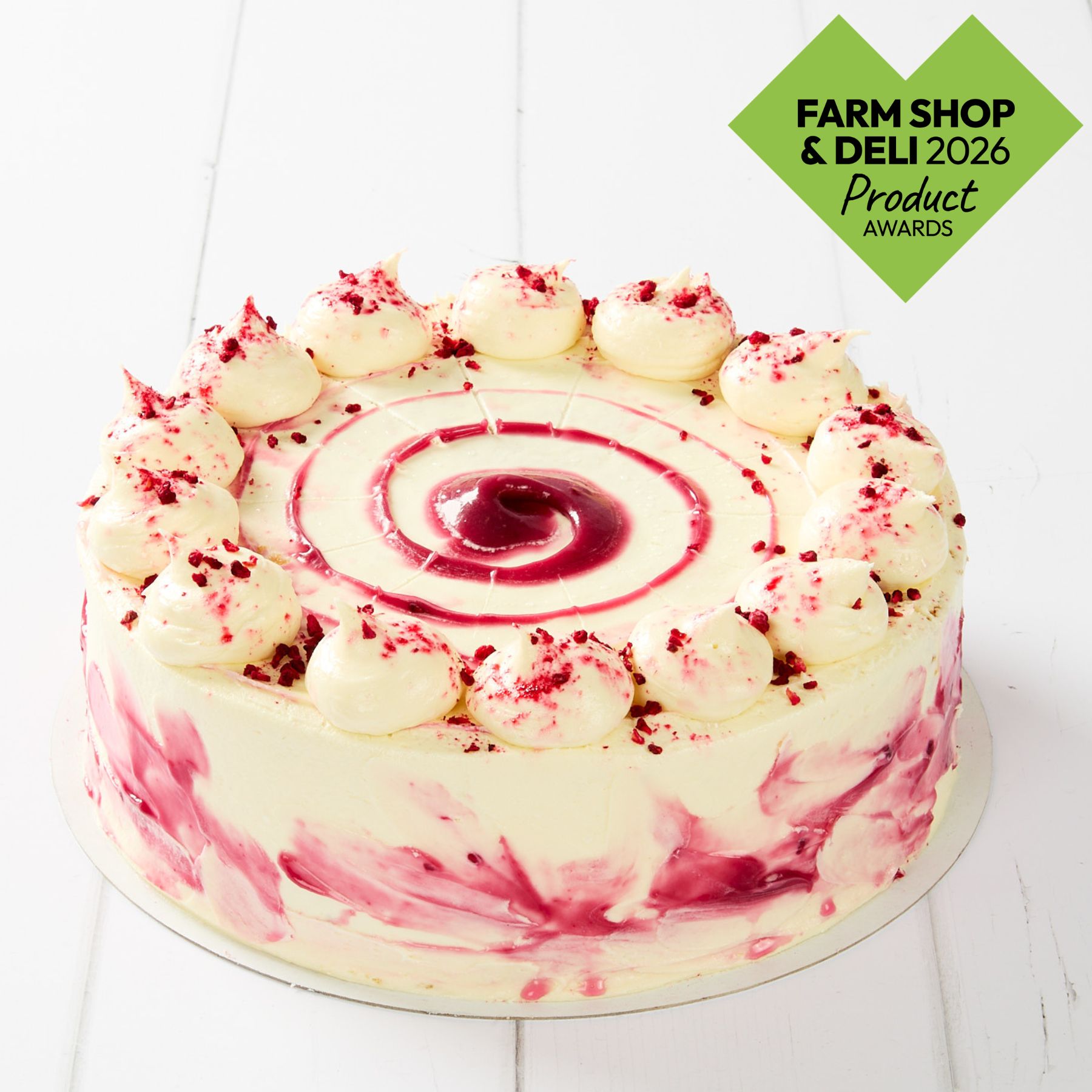 Awarded a silver medal at the Farm Shop & Deli Show Product Awards 2026, Just Desserts Raspberry Ripple Cake has been crafted for pure indulgence. A light raspberry sponge filled with gorgeous raspberry cream, coated in vanilla icing and topped with freeze dried strawberries. Beautifully presented with cream and raspberry swirls, this delicious dessert has been handcrafted with love to standout on your shelf. An ambient product, designed to decorate your display with an impressive shelf life of up to 5 days.
